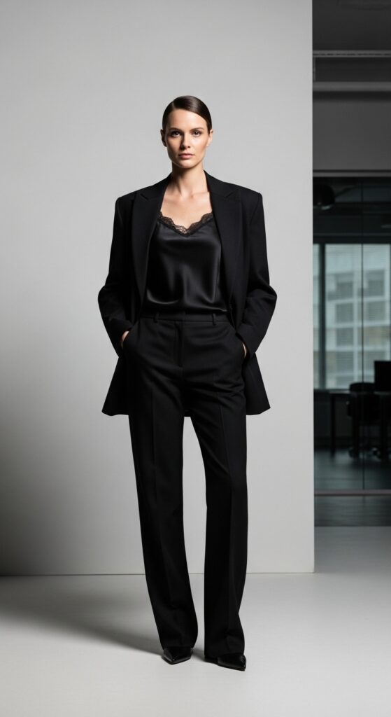 Going full black might sound boring, but executed correctly? It’s the most expensive-looking trick in the book. Think black trousers, black silk camisole, and a black oversized blazer. The secret is playing with textures, so mix matte with shiny, structured with flowy.