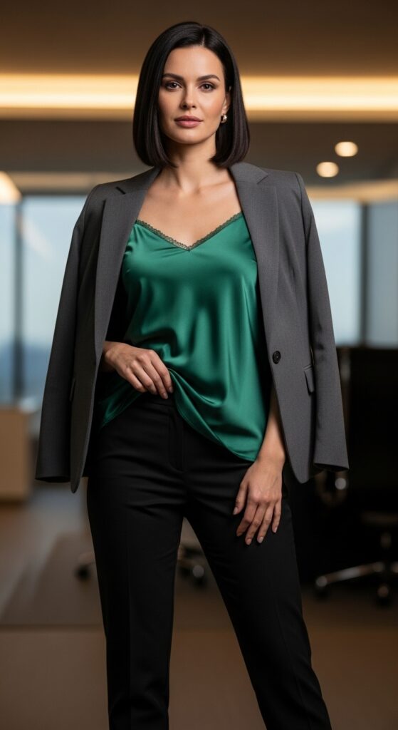 Want to look like you’re going somewhere important after work even if you’re just going home to watch reality TV? A satin cami in a jewel tone like emerald, burgundy, or sapphire paired with black trousers does exactly that. It’s dressy without being over the top, polished without being stuffy.