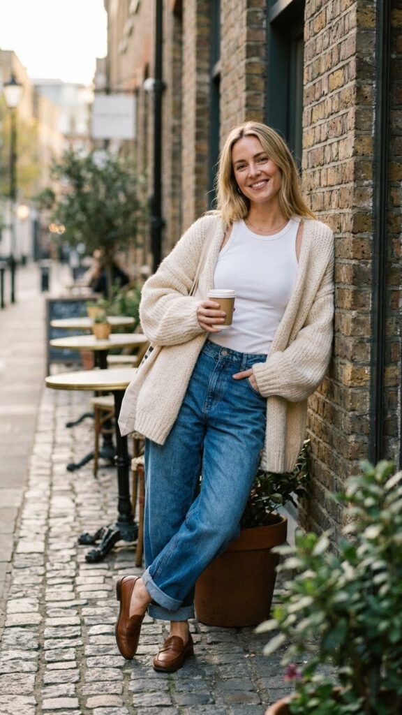 Pick an oversized cardigan in a soft, chunky knit and leave it open over a fitted tank or tee. The cardigan adds cozy layers while the baggy jeans keep things relaxed and easy. Add sneakers or loafers, maybe a crossbody bag, and you’re set. This outfit is perfect for working from home, lazy weekends, or those days when leggings feel too much like giving up but you still want maximum comfort. The best part? You can literally wear this while eating an entire pizza and nothing will feel tight. That’s the dream, honestly.