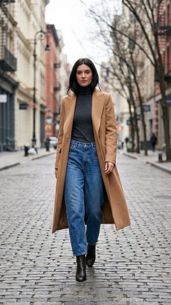 Choose a wool or trench coat that hits below the knee in a neutral color like camel, grey, or classic black. The length of the coat contrasts beautifully with the volume of the jeans, creating visual interest without overwhelming your frame. Wear a fitted turtleneck or simple sweater underneath, add heeled boots to add some height, and you’ve got an outfit that looks expensive and thoughtful. This is perfect for those days when you want to look polished but also need to be seriously warm. Function and fashion, we love to see it.