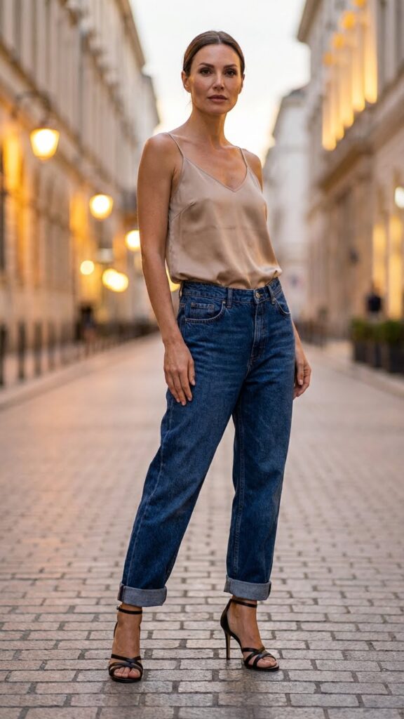Go for strappy heeled sandals or pointed-toe pumps in a neutral shade or even something bold like red. Pair with a silky camisole or bodysuit and add some statement jewelry. The baggy jeans keep the look from feeling too try-hard or overdressed, while the heels add that element of “yes, I’m going somewhere fabulous.” This works for dinner dates, nights out, or anytime you want to dress up your denim without reaching for skinny jeans. The longer inseam of baggy jeans actually looks amazing with heels, creating those long, elegant lines we all want.