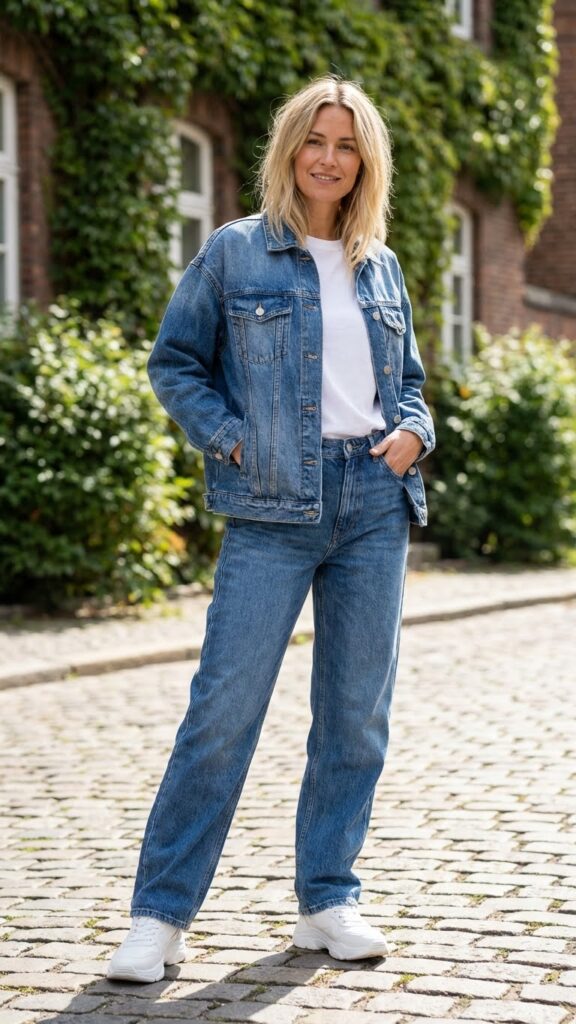 Choose a denim jacket in a similar or slightly contrasting wash (light jacket with medium jeans, or vice versa) and wear it over a white tee or striped shirt. Keep the rest simple with white sneakers and minimal accessories so the denim does the talking. This outfit gives major 70s vibes but feels totally modern, especially with the relaxed fit of the jeans. It’s perfect for transitional weather and makes you look like you really understand fashion, even if you’re just copying this exact outfit. No shame, we all do it ✨