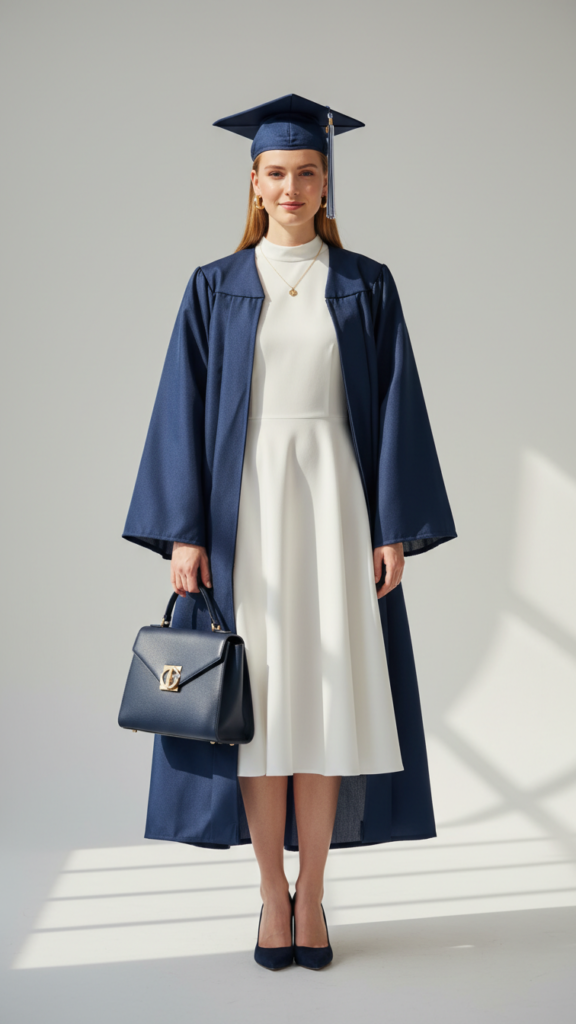 Navy pumps, a structured handbag, and delicate jewelry complete this polished ensemble without competing with your cap and gown. The fresh and chic aesthetic of white graduation outfits makes them particularly photogenic for capturing this important milestone.