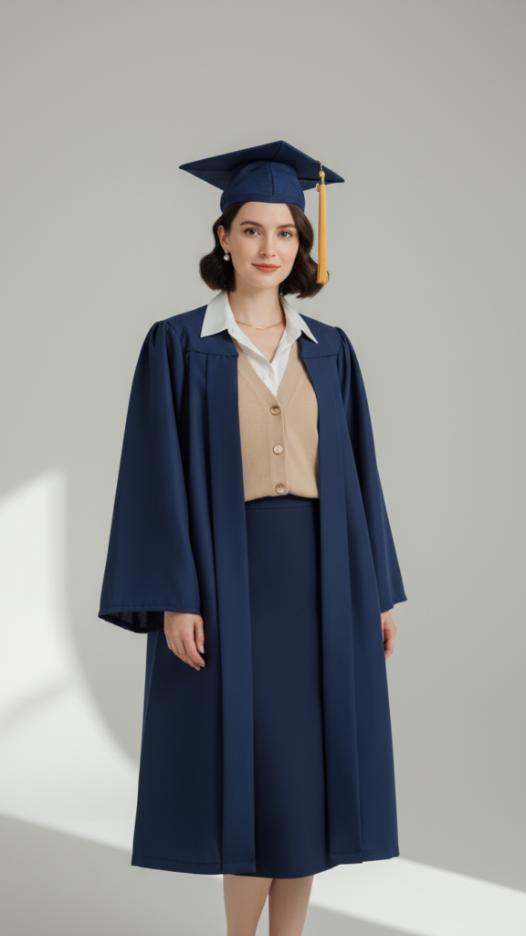 Why settle for ordinary when you can achieve timeless sophistication with a beige cardigan and professional skirt combination that works seamlessly under your graduation gown? This versatile pairing offers the perfect balance of comfort and elegance for your special day.