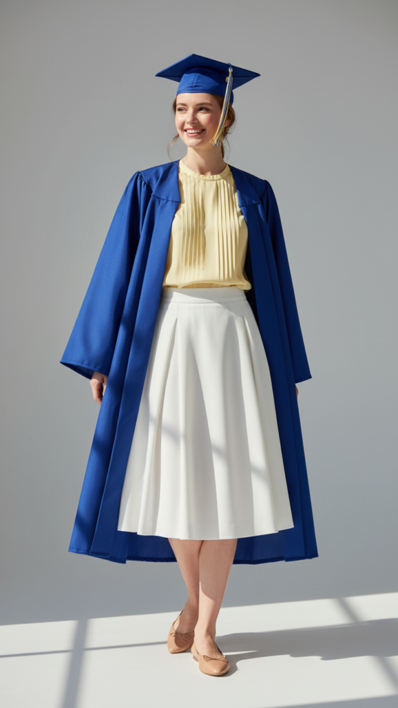 Choose a pleated skirt silhouette in white for timeless elegance that photographs beautifully. The soft yellow adds warmth without overwhelming your overall look. You’ll feel confident knowing this pairing works for any graduation ceremony, from intimate gatherings to large university events. Complete the ensemble with nude flats and minimal jewelry for polished sophistication.