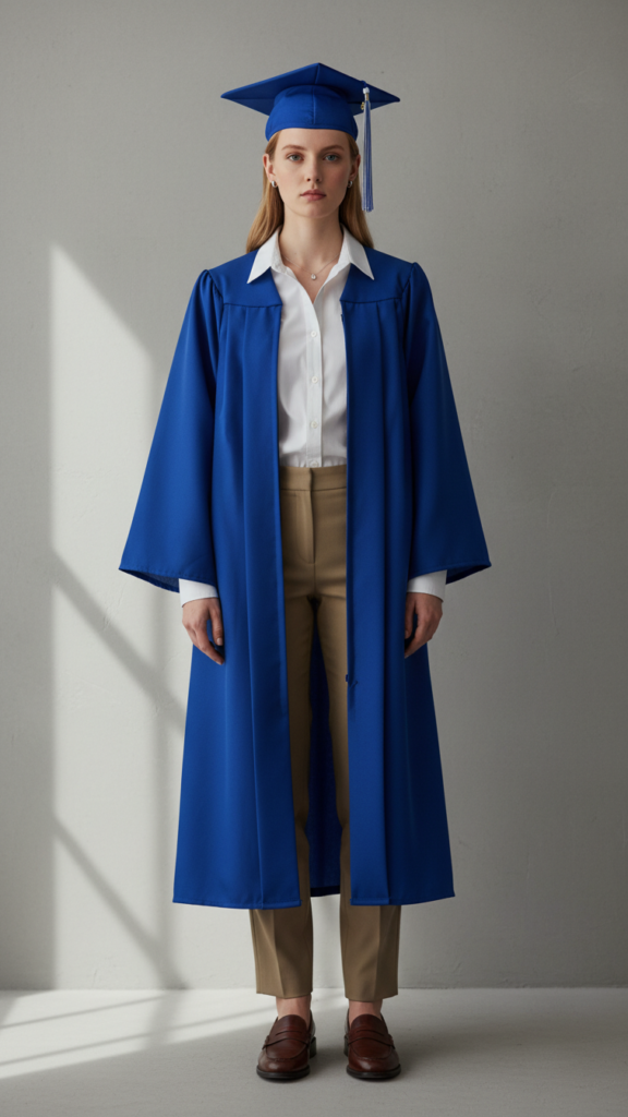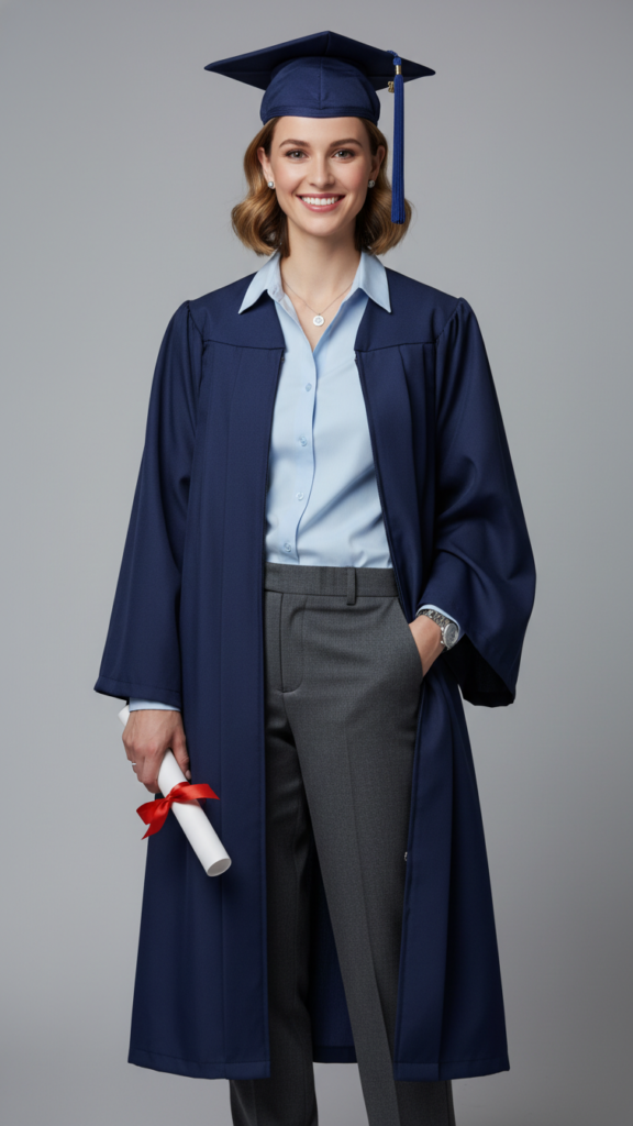 Select pants with a personalized silhouette that flatters your figure and creates clean lines. Dark navy, charcoal gray, or classic black pants work exceptionally well, offering professional polish that moves seamlessly from graduation photos to family dinners. This combination ensures you’ll have a polished and memorable look that stands out in all your graduation photos.