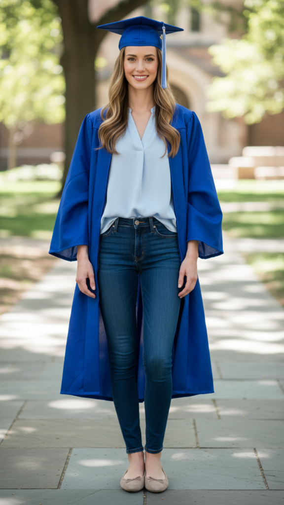 Your light blue blouse complements your cap and gown beautifully while providing breathable comfort during long ceremonies. Dark wash jeans create a sleek foundation that photographs well and allows easy movement.