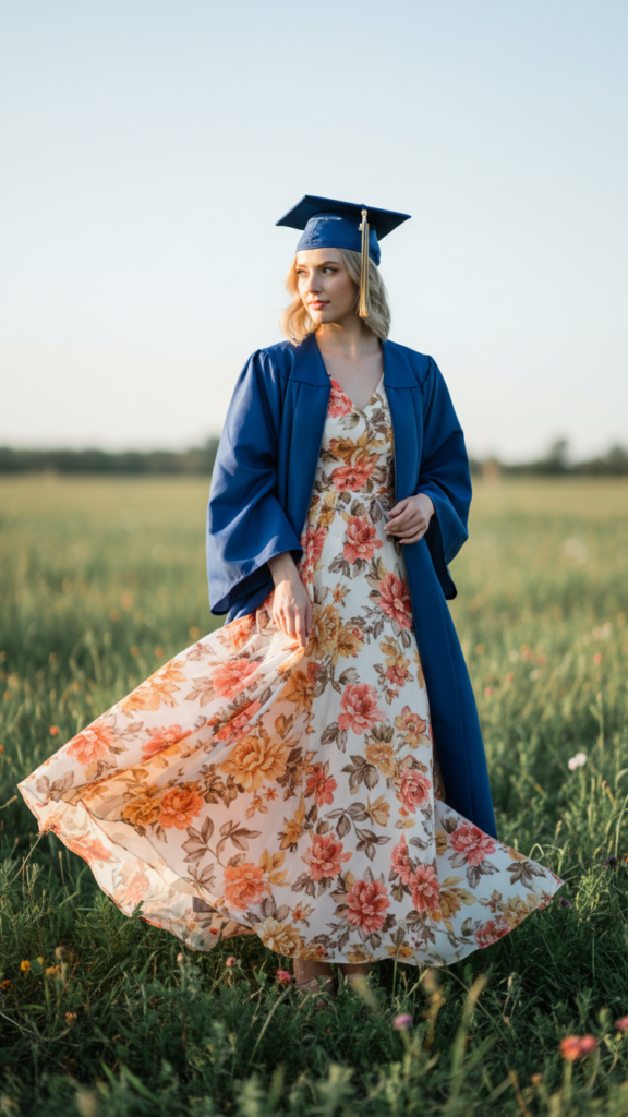 You’ll want to select medium-sized prints that won’t compete with your cap and gown’s significance. Complete your look with floral printed accessories such as delicate earrings or a subtle bracelet. Consider adding a coordinating headpiece underneath your graduation cap for photos after the ceremony. This approach creates a cohesive, celebratory ensemble that photographs beautifully.