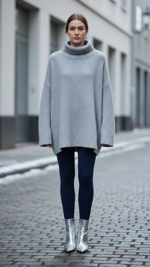 Navy Leggings With Oversized Grey Sweater and Silver Ankle Boots