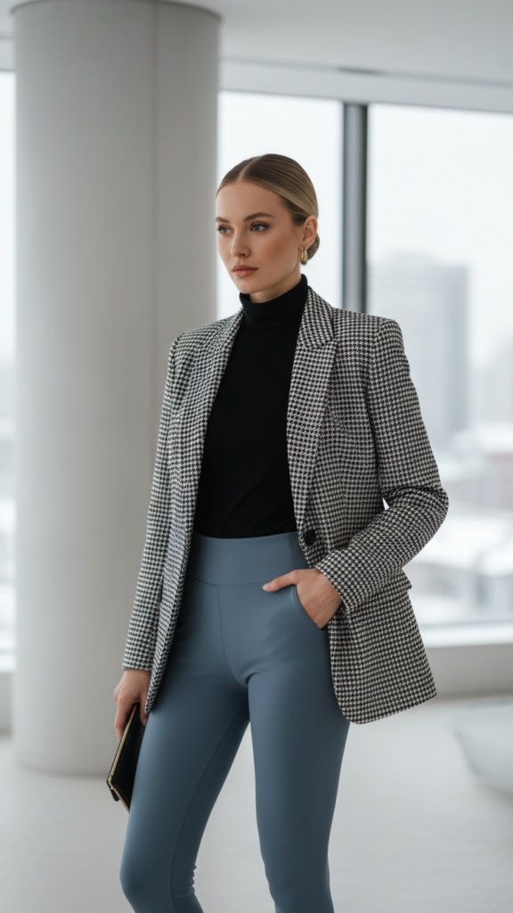 Dusty Blue Leggings With Black Turtleneck and Houndstooth Blazer