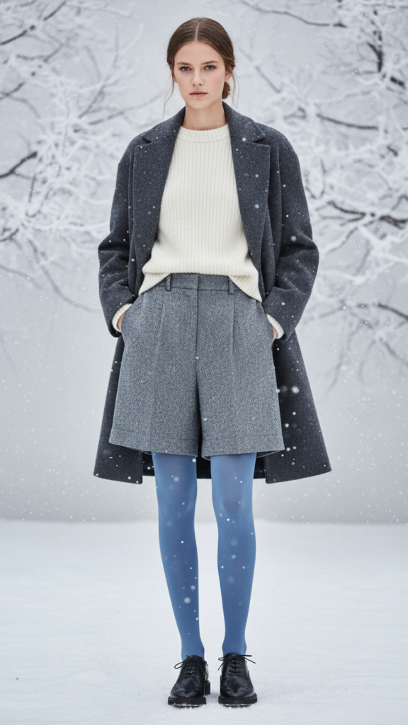 Sky Blue Leggings Under Grey Wool Shorts With Tights and Oxford Shoes