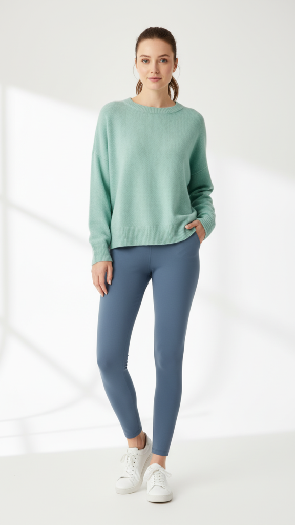 Slate Blue Leggings With Mint Green Pullover and White Sneakers