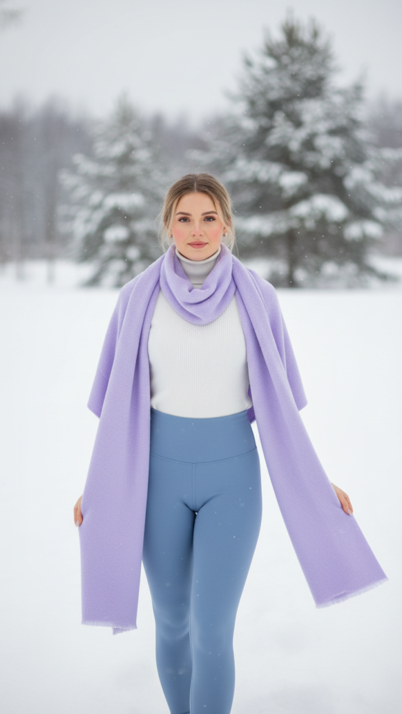 Powder Blue Leggings Paired With White Turtleneck and Lavender Scarf