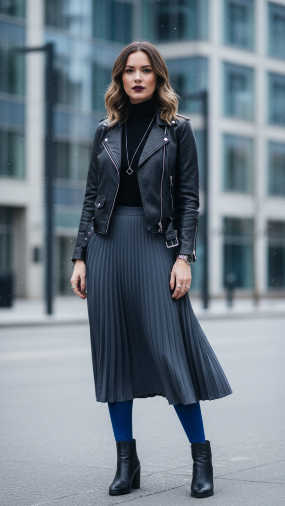 When you layer cobalt leggings under a charcoal midi skirt, you’re creating a sophisticated look that combines comfort with edge. The rich blue peek-a-boo effect adds visual interest while keeping your legs warm throughout winter days. You’ll find this combination works perfectly with a black leather jacket for that rebellious-meets-refined aesthetic.