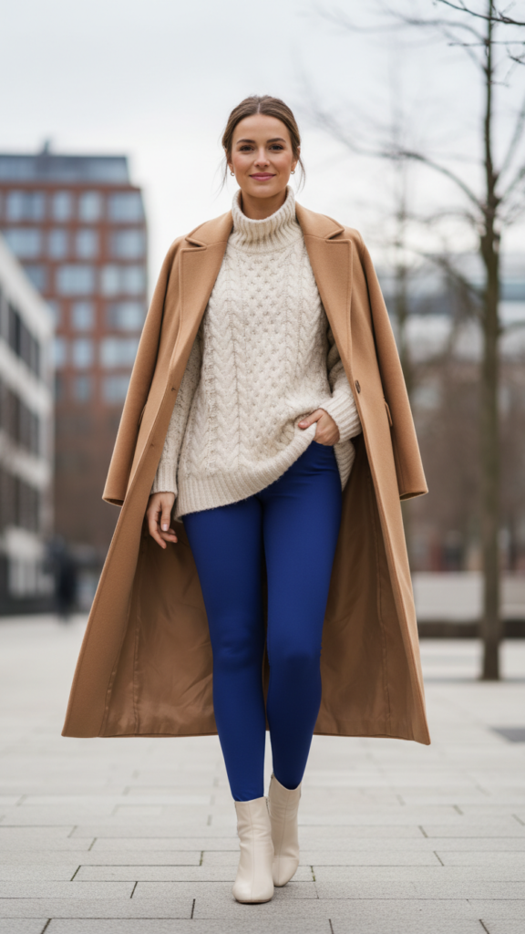 Royal Blue Leggings With Cream Cable Knit and Camel Coat