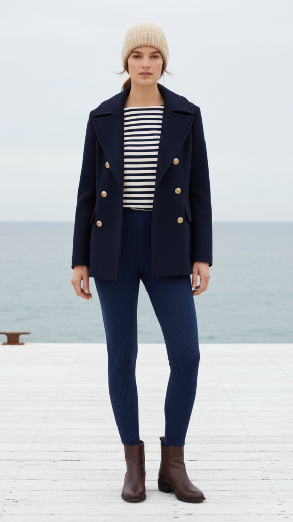 Steel Blue Leggings Styled With Striped Breton Top and Navy Peacoat