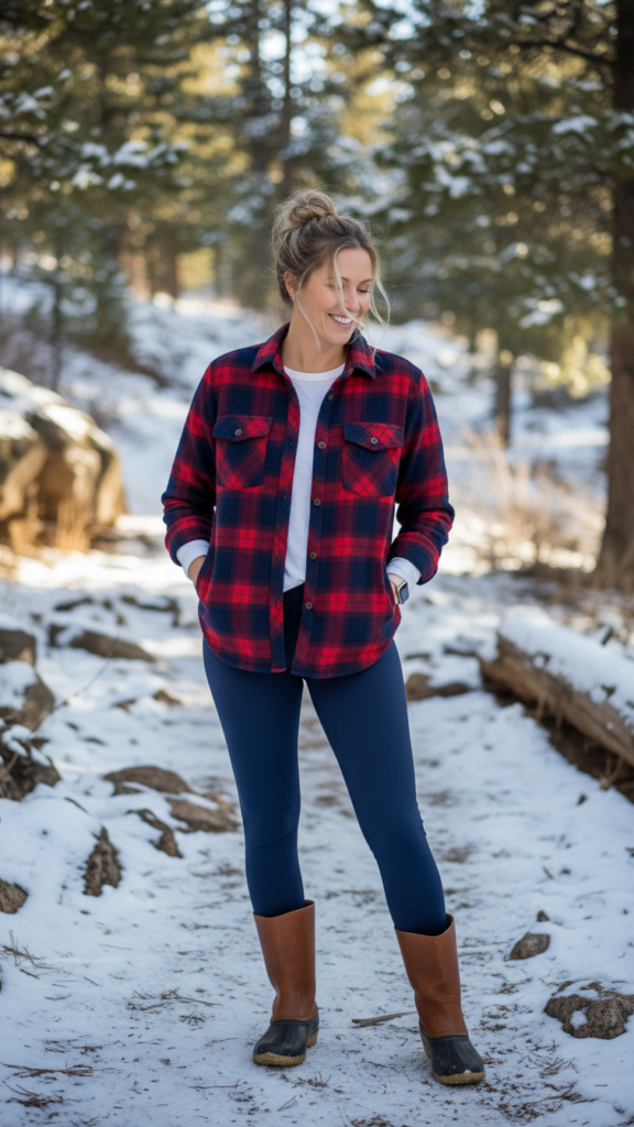 Nothing captures casual winter comfort quite like pairing classic blue leggings with a plaid flannel shirt and sturdy duck boots. You’ll create one of the most stylish cold weather looks that’s both practical and effortlessly chic.