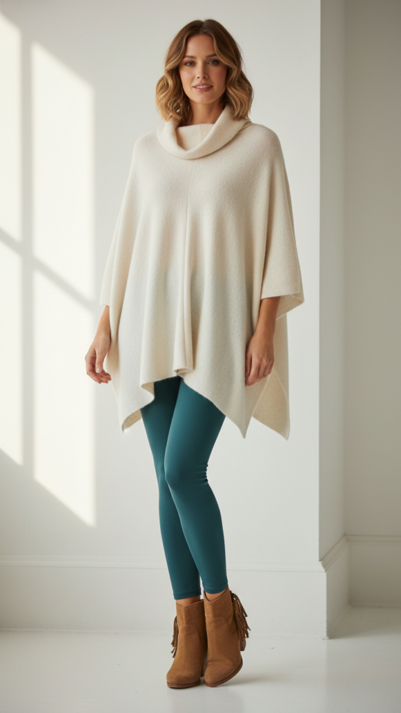 Teal Leggings Matched With Ivory Poncho and Suede Booties