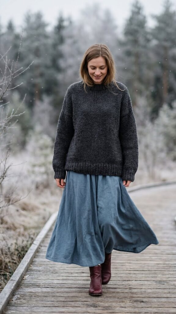 For a cozy yet sophisticated winter look, you can’t go wrong with a dusty blue maxi skirt paired with a charcoal chunky knit sweater. This combination gives you effortless style while keeping you warm during colder months.