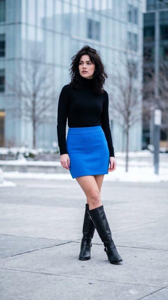 Pair your skirt with black leather boots for a sleek, edgy foundation. Knee-high or metallic leather boots add extra warmth and visual interest to your look. The contrast between electric blue and black creates a striking balance that feels both daring and polished.