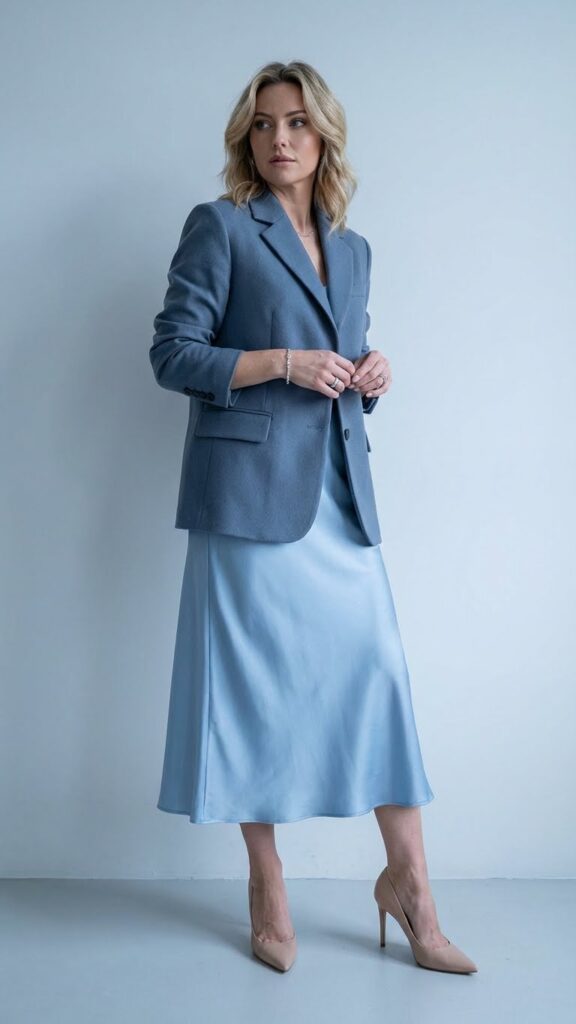 The magic happens when you layer a structured slate blue blazer over your flowing satin piece. This tonal pairing creates visual depth without overwhelming your frame. You’ll appreciate how these cool hues complement winter’s tranquil environment while letting you stand apart from darker seasonal palettes.