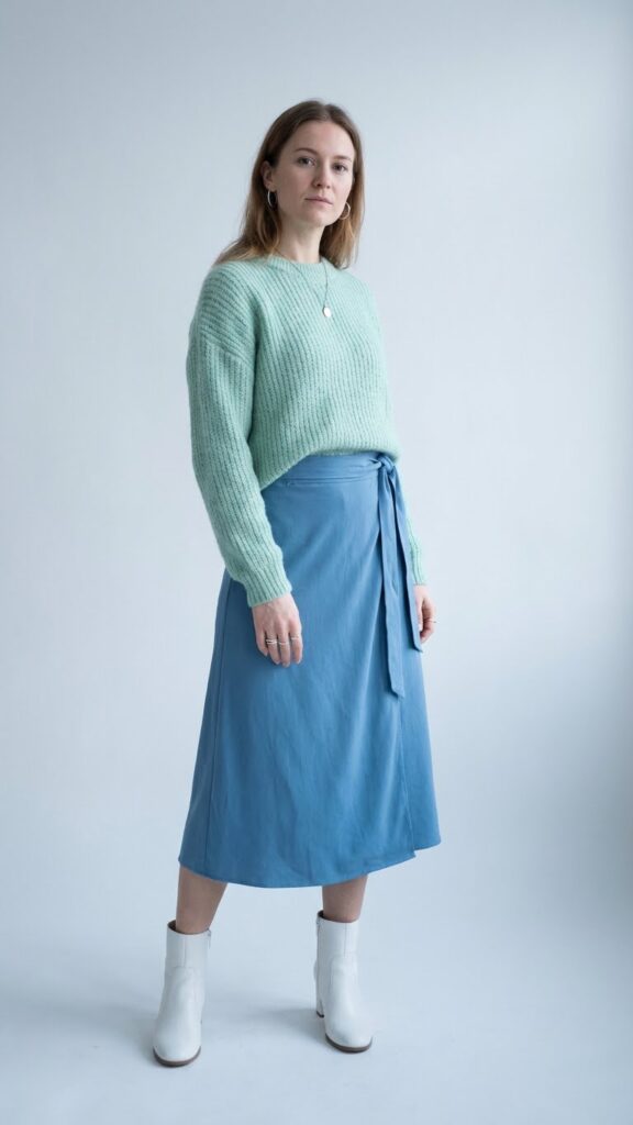 When you’re ready to adopt bolder color mixing, a cerulean wrap skirt paired with a mint green sweater delivers unexpected harmony. This cozy chic pairing creates visual interest while keeping your winter look fresh and modern. The wrap silhouette offers adjustable comfort, letting you move freely throughout your day.