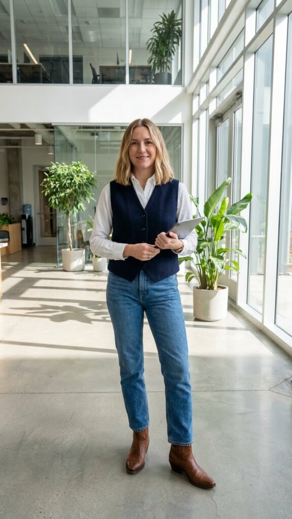 Go for a classic white or striped button-down tucked into your favorite straight-leg or bootcut jeans (yes, bootcut is back—embrace it). Layer a sleek vest over top—think tailored and fitted, not puffy. Then add your Western-style ankle boots with their pointed toes and signature stitching.