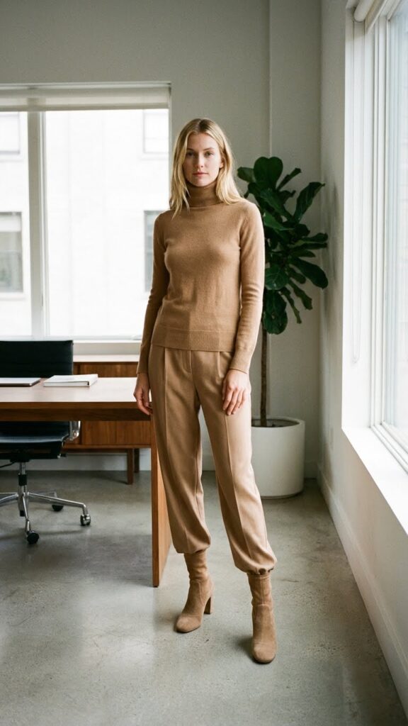 Okay, this one makes me feel like I should be strutting through a European city with a coffee in hand, but it works just as well for your Tuesday morning meeting. Fitted turtlenecks are fall’s secret weapon, and when you pair one with flowy wide-leg trousers, you get this effortlessly chic silhouette that photographs beautifully.