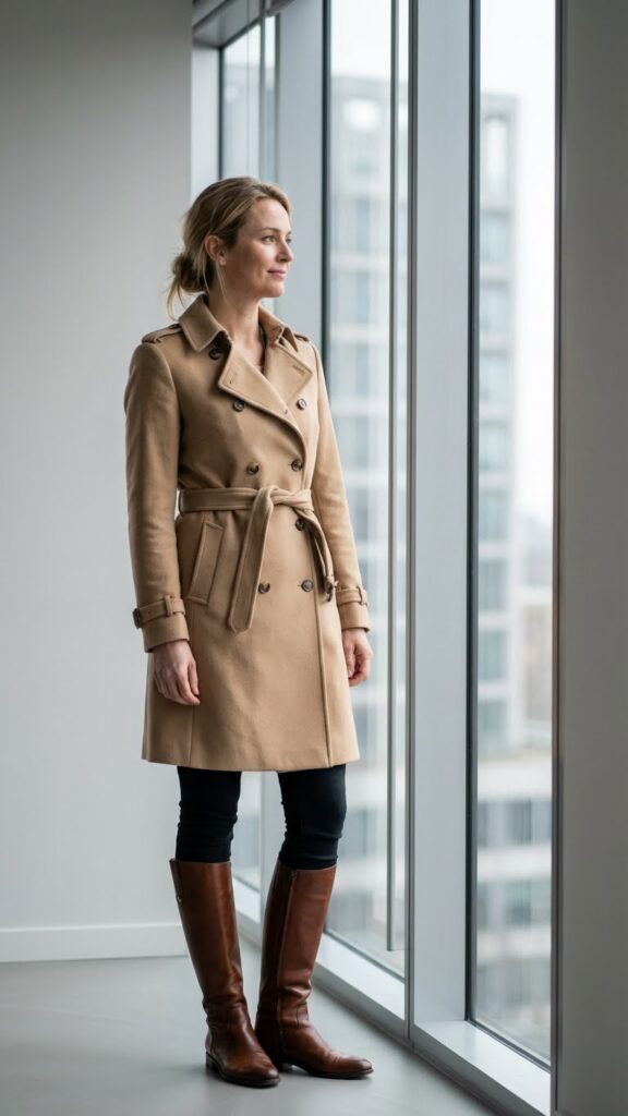 Opt for a khaki or camel trench—it’s the most versatile color and works with basically everything in your closet. Underneath, keep it simple with a lightweight sweater or button-down and fitted trousers. The tall riding boots are essential here because they give you that equestrian-chic vibe without actually requiring a horse.