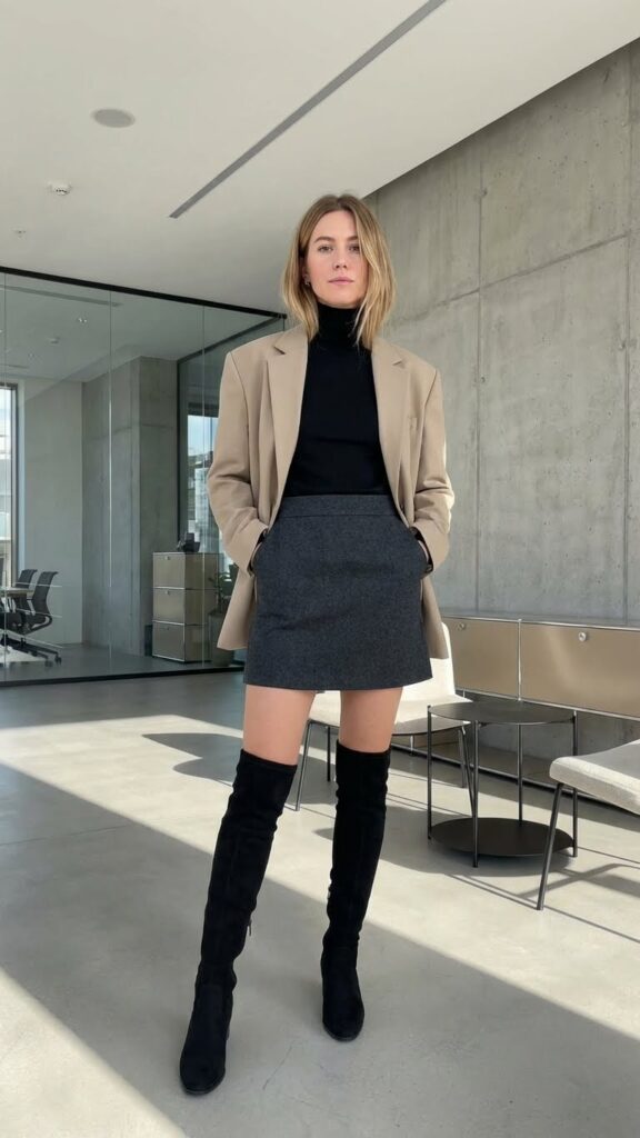Okay, hear me out on this one because the proportions might sound wild, but they actually work perfectly. An oversized, borrowed-from-the-boys blazer paired with a mini skirt and over-the-knee boots creates this fashion-forward look that’s still totally office-appropriate.