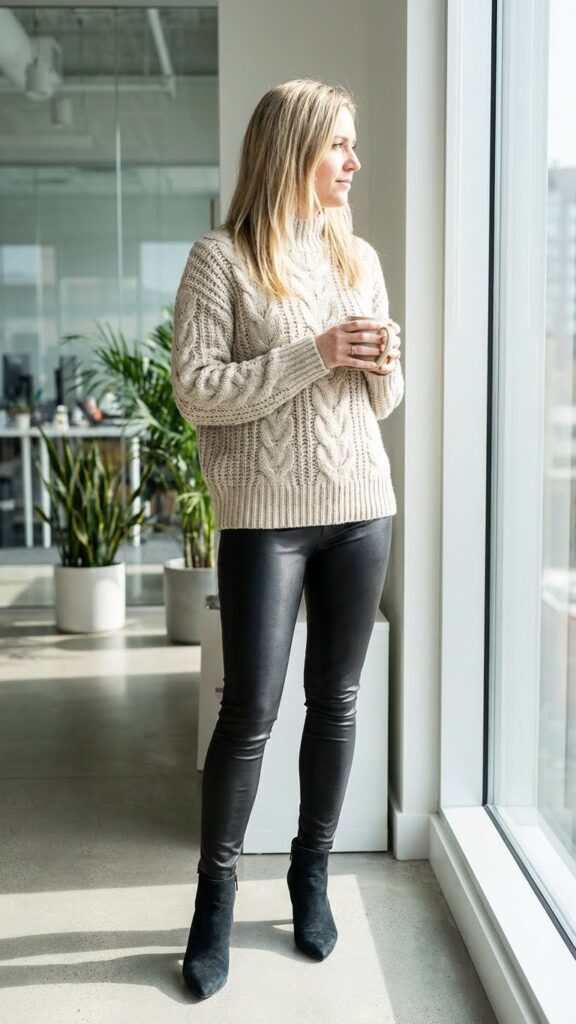 Pair them with a chunky cable-knit sweater that’s long enough to cover your hips—this is key for keeping the look balanced and office-appropriate. Add some sleek ankle booties with a pointed toe to dress everything up. The contrast between the cozy knit and the sleek leather creates visual interest without requiring any additional effort.