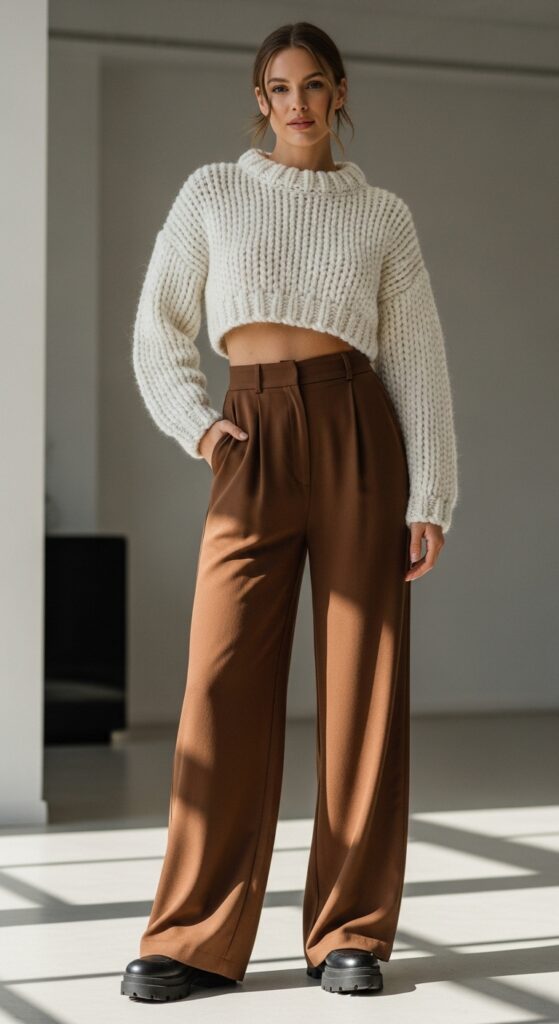 This combo is basically a warm hug that also makes you look incredibly put together. There’s something about pairing rich brown trousers with a chunky cream knit that screams “I woke up like this” in the best way possible.