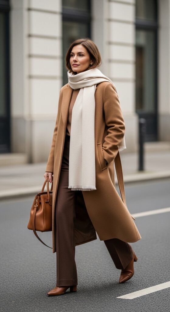 The key is playing with different shades and textures within the same color family. Maybe your pants are deep chocolate while your coat leans more towards that golden camel. Add a cream scarf and tan bag to round out the palette.