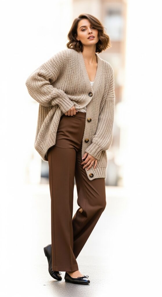 For those days when comfort is queen but you still want to look cute, this combo delivers. A chunky cardigan over brown trousers gives all the cozy fall energy without sacrificing style.