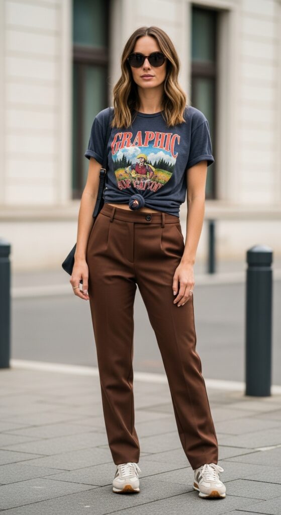 The contrast between a casual tee and elegant brown trousers creates this interesting tension that just works. Think band tees, retro logos, or something with a fun print. Tuck it in partially for that intentional effortless look.