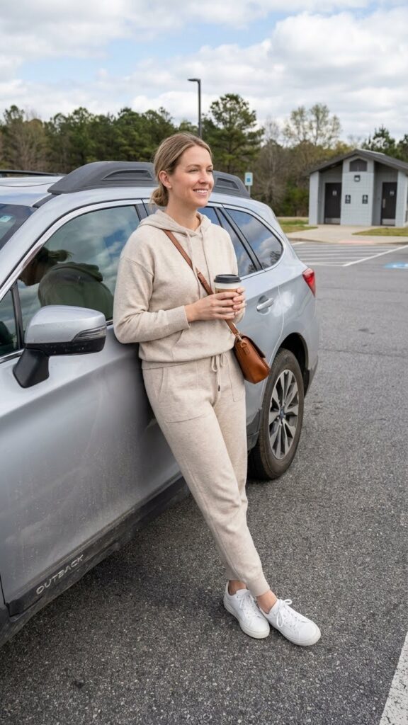 Here’s why this works: you look intentional without trying. Throw on a matching hoodie and jogger set in a neutral like camel, gray, or even a fun lavender, and you’ve basically assembled an outfit in 30 seconds. The coordinated vibe reads as “I thought about this” even though you absolutely rolled out of bed and grabbed the first thing you saw.