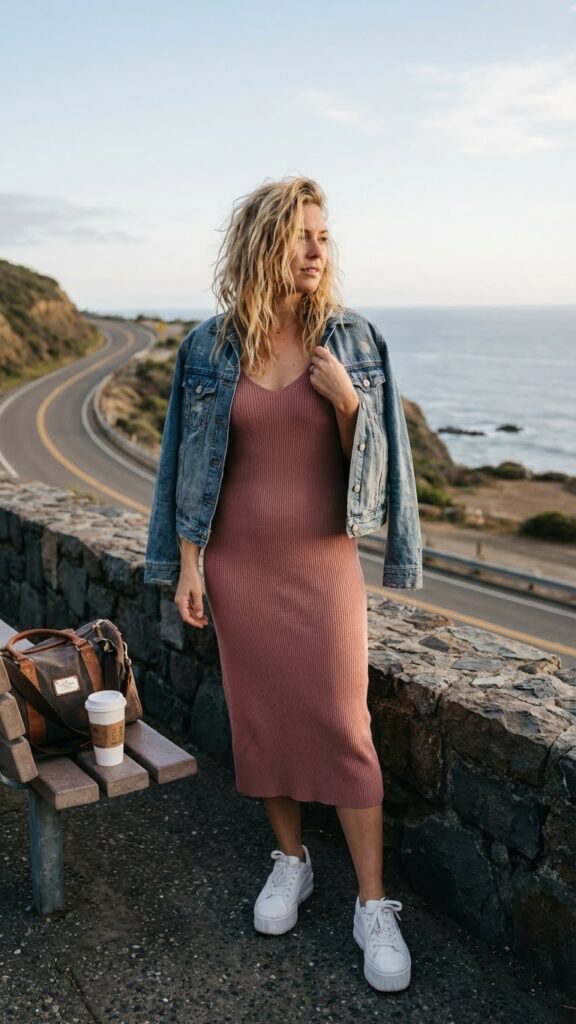 Is there anything more effortless than a midi dress? For road trips, you want something flowy and stretchy, think ribbed knit or jersey fabric that moves with you. A t-shirt dress or a casual midi in a solid color keeps things simple but elevated.