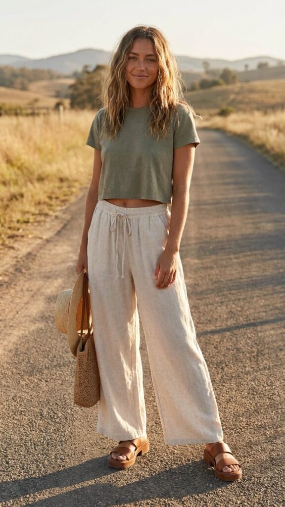 Pair them with a simple cropped t-shirt or tank that hits right at your natural waist. This creates a balanced silhouette and keeps things breezy. The crop shows just a hint of skin without being too much, and tucking isn’t necessary since the proportions already work.