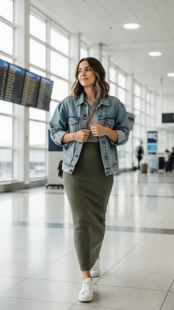 The sneaker pairing is what makes this work for airports. It keeps the look grounded and practical while the skirt adds femininity. Tuck in a simple tee or tank, add a denim jacket, and you’ve got an outfit that works for multiple climates and occasions. Plus, you can totally curl up in your seat comfortably, which is the real test of a good travel outfit.
