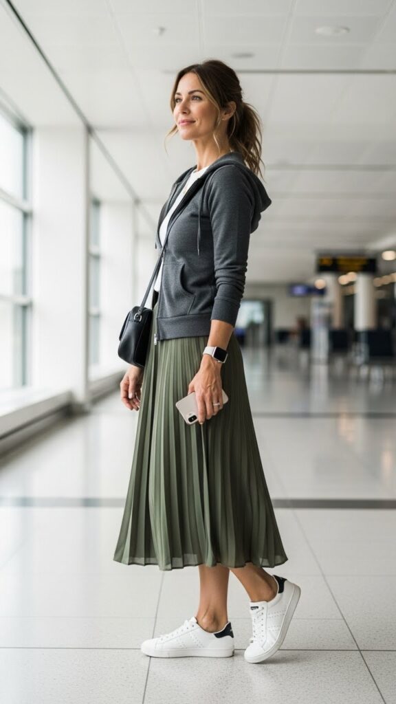 Choose a skirt in a soft knit or jersey fabric so it’s still travel-friendly and won’t wrinkle. The hoodie should fit well through the shoulders but be relaxed enough for easy movement. Sneakers are the obvious choice here, but ankle boots could also work for cooler weather. This outfit feels fresh and current while being completely functional for hours of travel.