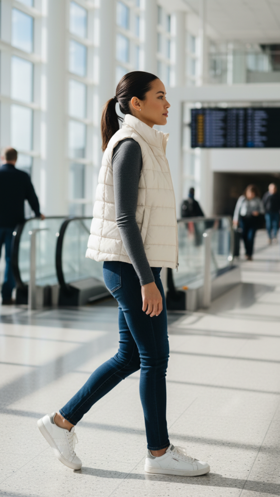 Choose neutral-colored vests that complement multiple base layers for maximum versatility. Pair with comfortable jeans or travel pants for a polished yet relaxed appearance. Versatile accessorizing options include scarves, crossbody bags, and comfortable sneakers. This combination adapts seamlessly from chilly departure gates to varying cabin temperatures during flight.