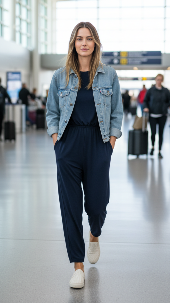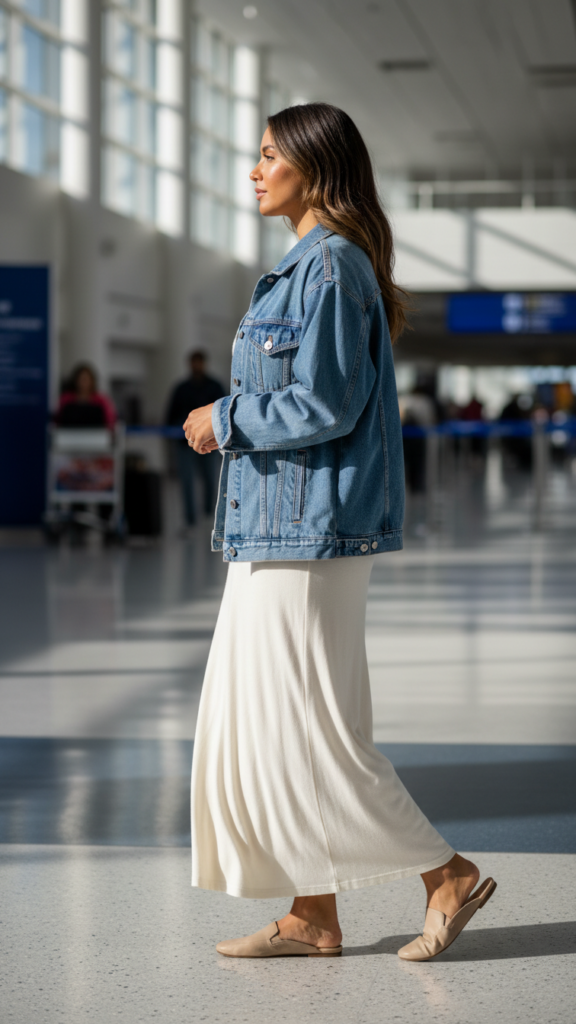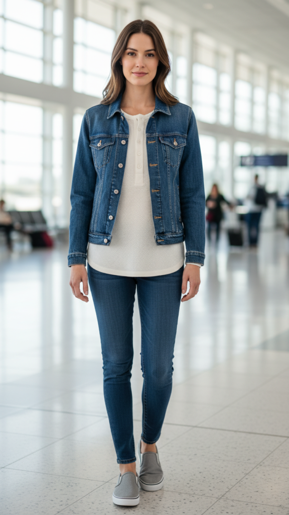 Layer your denim jacket for versatility—remove it during warmer terminal walks or add it back for chilly boarding areas. Complete this look with simple accessories like comfortable slip-on shoes and a crossbody bag for hands-free convenience.