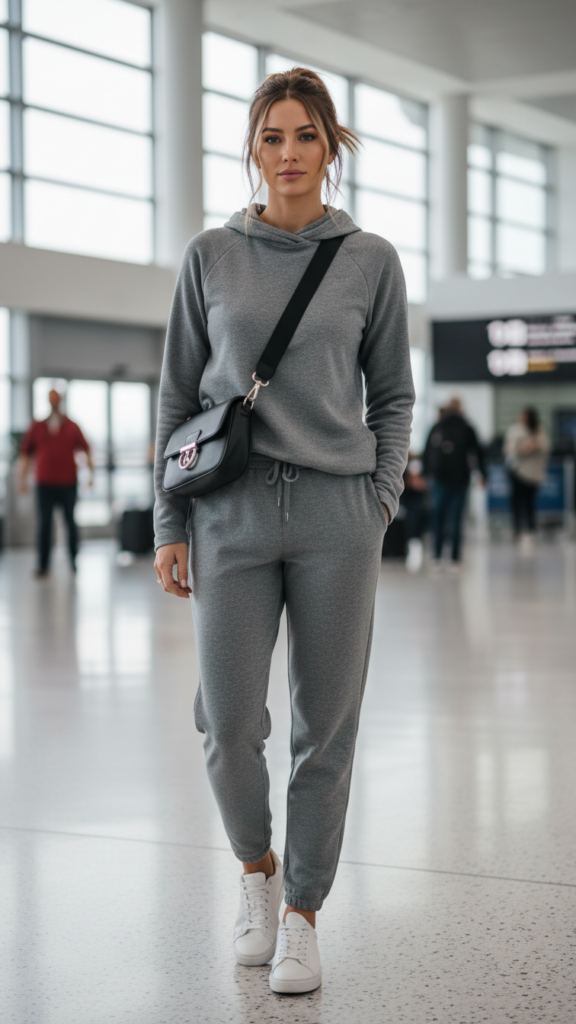 Nothing beats the comfort and practicality of an athleisure ensemble when you’re facing long travel days and multiple airport connections. A cozy hooded sweatshirt paired with matching joggers creates the perfect foundation for stress-free movement through terminals.