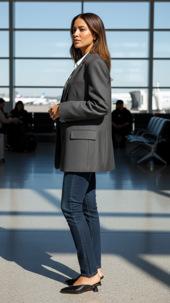 This versatile combination moves fluidly between casual travel moments and unexpected professional encounters throughout your excursion. Trendy winter airport outfits like this blazer-and-jeans pairing offer the perfect balance of style and practicality for fashionable travelers.