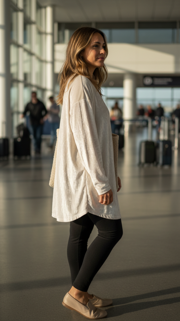 Black leggings offer the perfect foundation with their sleek silhouette that moves with you through terminals. Choose high-waisted styles for better coverage when sitting. Complete this versatile look with slip-on sneakers and a crossbody bag, giving you effortless style that shifts seamlessly from departure gate to destination.
