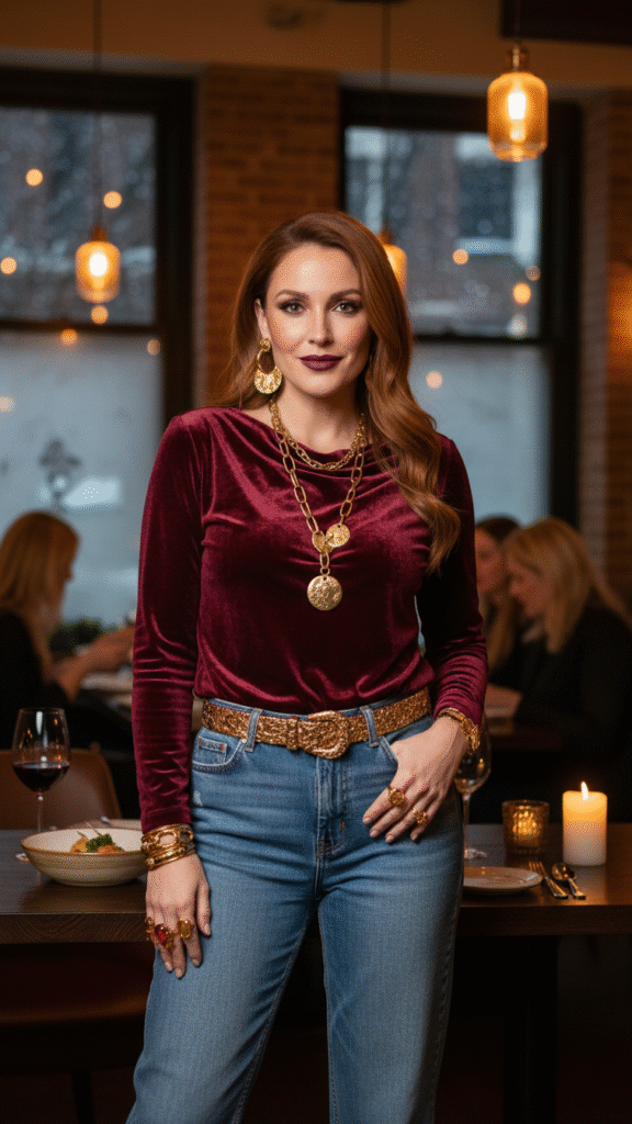 Velvet tops bring luxurious texture to your casual winter dinner outfit without looking overdressed. You’ll love how this fabric catches light and adds depth to medium wash jeans. Choose jewel tones like emerald or burgundy for maximum impact, or stick to a monochrome palette with black velvet and dark denim.