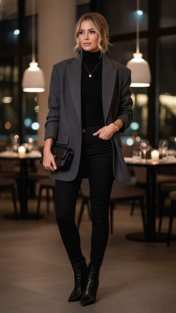 Power dressing takes a relaxed turn when you combine an oversized blazer with skinny jeans and ankle boots. This outfit formula lets you move freely while maintaining polished sophistication for any winter dinner venue.