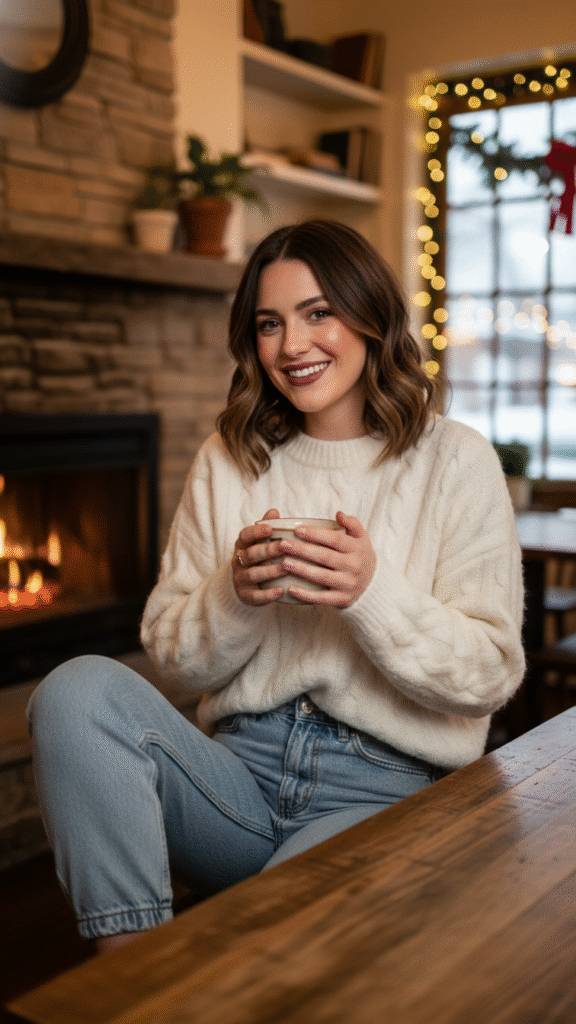 When comfort meets style, nothing beats the classic combination of a chunky knit sweater paired with high-waisted mom jeans. This modern take on relaxed dressing creates an effortlessly chic silhouette that’s perfect for casual winter dinners. Casual winter dinner outfit ideas are perfect for relaxed nights out. You’ll love how the voluminous sweater balances the structured fit of mom jeans while keeping you warm.