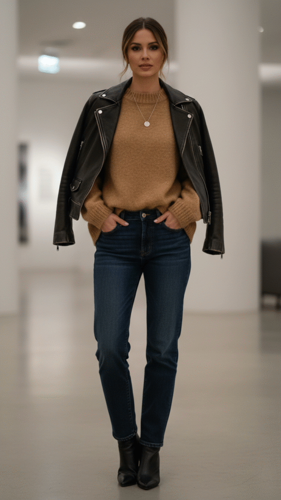 Adding a leather jacket over a cashmere sweater instantly alters your dark denim into a dinner-ready outfit with edge and sophistication. You’ll love how this luxe fabric pairing creates visual interest while keeping you warm during winter evenings. The contrast between smooth leather and soft cashmere adds depth to your look.