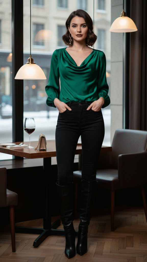 Silk blouses convert black skinny jeans into refined winter dinner attire that’s both stylish and comfortable. You’ll achieve an elevated look by choosing jewel-toned or neutral silk that drapes beautifully when tucked in. The combination creates sophisticated layered textures that work perfectly for restaurants or evening gatherings.